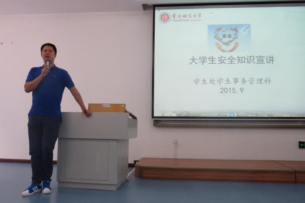为帮助2015级新生更快地适应大学生活,提高新生安全意识,必一运动(官方网站)B·Sport-权威运动资讯网站在2015年9月13日下午14:30举办了一场关于大学生安全知识的讲座,重师学生事物管理科李鑫老师担任了此次讲座的主讲人。
