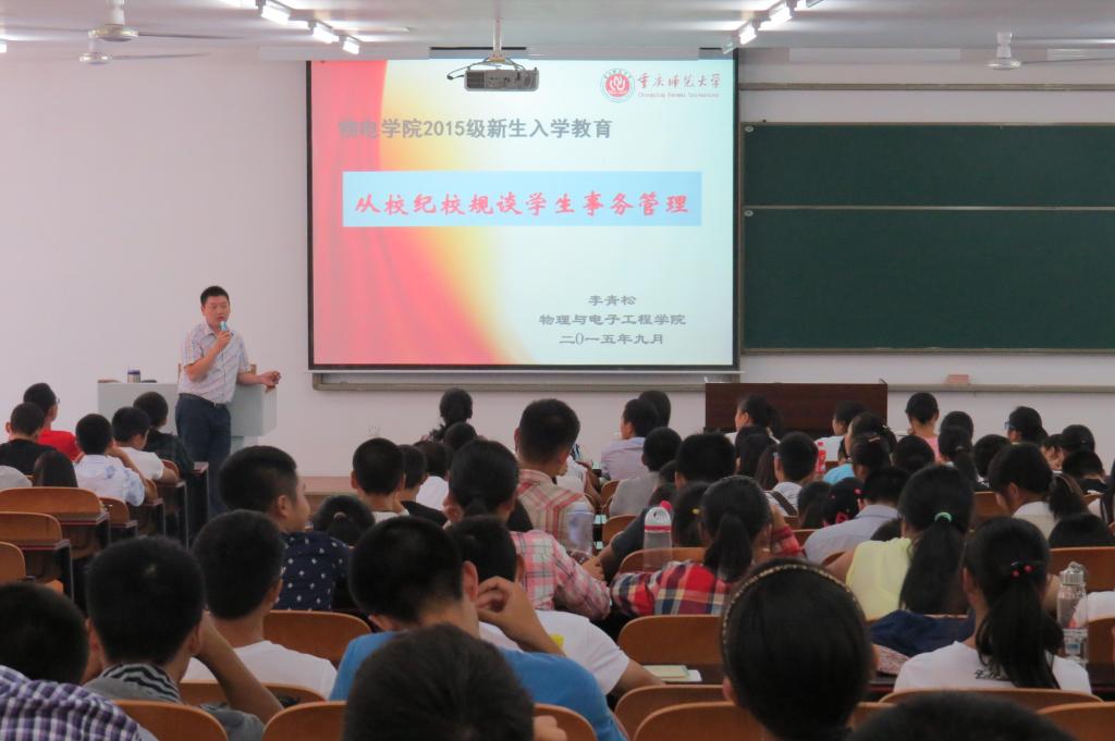 为了帮助2015级新生更快,更好的适应大学生活,2015年9月13日,必一运动(官方网站)B·Sport-权威运动资讯网站在励志楼2113开展了从校纪校规谈学生事务管理的讲座。15级辅导员陈禹辛担任主持,李青松老师主讲。