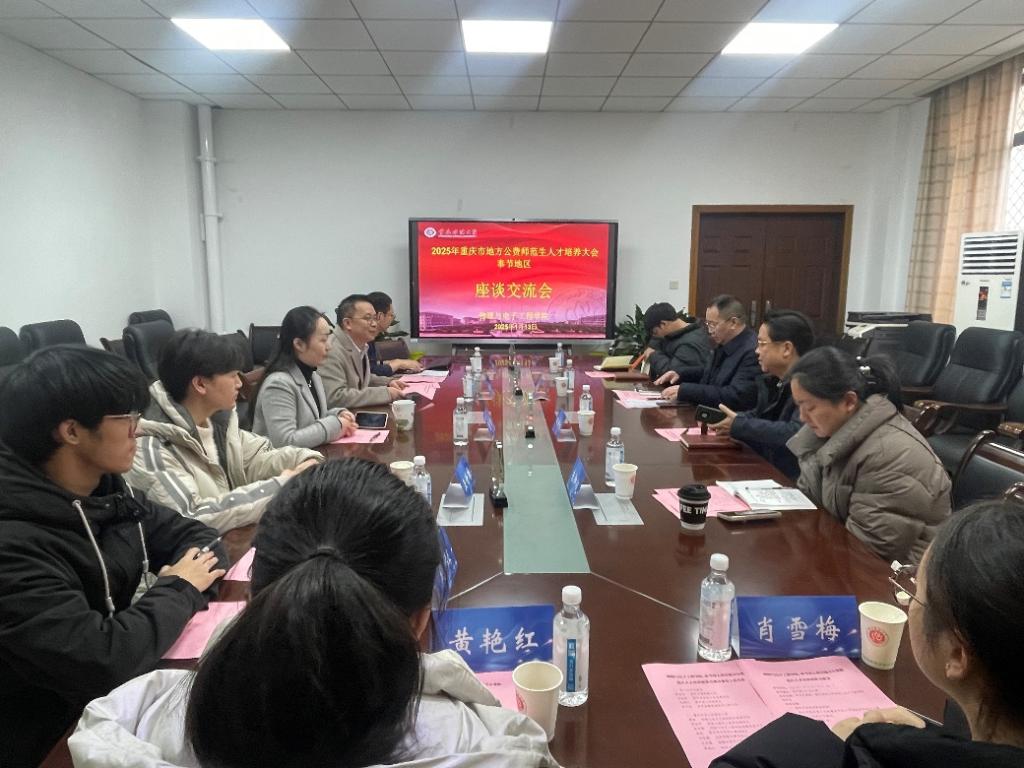 2025年1月13日下午,重庆师范大学地方公费师范生人才培养大会奉节分会场交流会在必一运动(官方网站)B·Sport-权威运动资讯网站顺利召开。奉节县教委副主任唐承念,奉节县永安中学党委书记田树林,奉节县人社局人事科科长朱卿仪,奉节县进修学院培训处副主任李子钰,必一运动(官方网站)B·Sport-权威运动资讯网站党委副书记曾艳、副院长罗海军、物理系系主任朱洪强参加座谈会。我校“地方优师计划”定向奉节县的四位在读本科生参会。