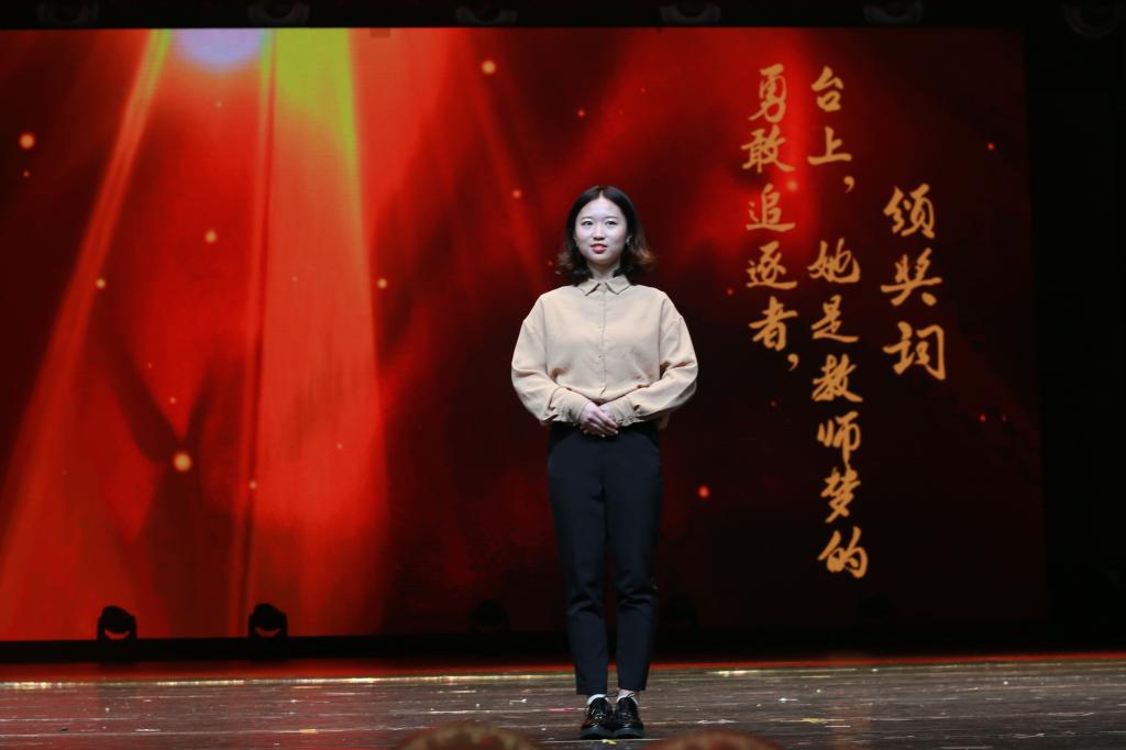 紧接着,获奖代表高鑫上台发表获奖感言,她表示很荣幸当选十大影响人物,在以后的工作中和学习中也会更加努力,做好这个榜样,不负众望。同时对辛勤付出的老师和曾经帮助过她的同学们表示衷心的感谢,并且呼吁学弟学妹们坚定理想,逐梦前行。