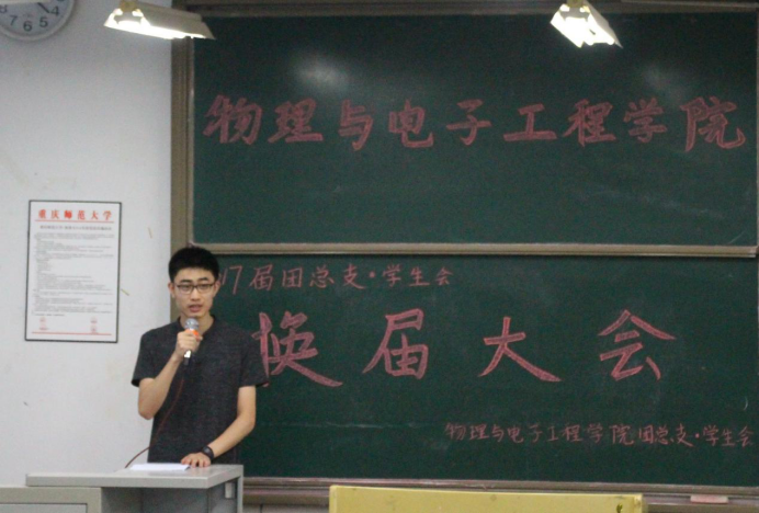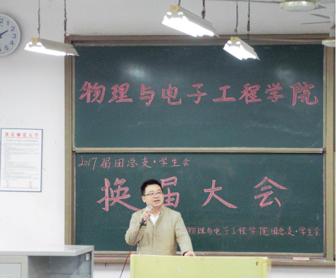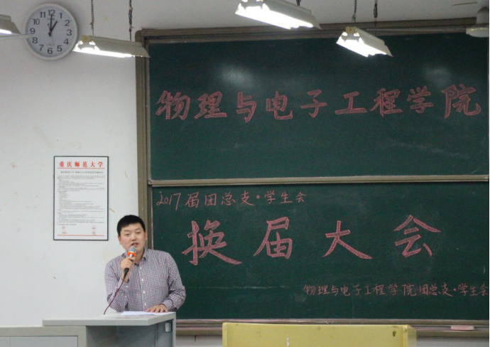 会议最后,冉书记上台致辞。他强调团总支学生会是一个锻炼的舞台,学生干部应该抛弃杂念、恪尽职守,脚踏实地,走好每一步。同时,冉书记也指出,物电学院团总支学生会要在不断地学习和思考中实现社会价值;以一带一路之例,指出学生之间要学会合作,在不断合作中,实现共赢,携手共进,实现辉煌。物电学院有许多需要传承的精神和文化,不仅要传承,更要懂得创新。创新是发展的动力、是进步的灵魂,国家在创新、团总支学生会工作也应该不断地创新和发展。最后,他指出,学生干部应当处理好老师和学生之间、学生和班级之间的关系,应当做好相应的交流与沟通。作为学生干部,自身应该以谦逊的态度对待同学朋友、端正身份、做好学生工作的同时,更要加强对学习的重视,并对新一届的团总支学生会给予厚望,希望能再接再厉,勇创辉煌。