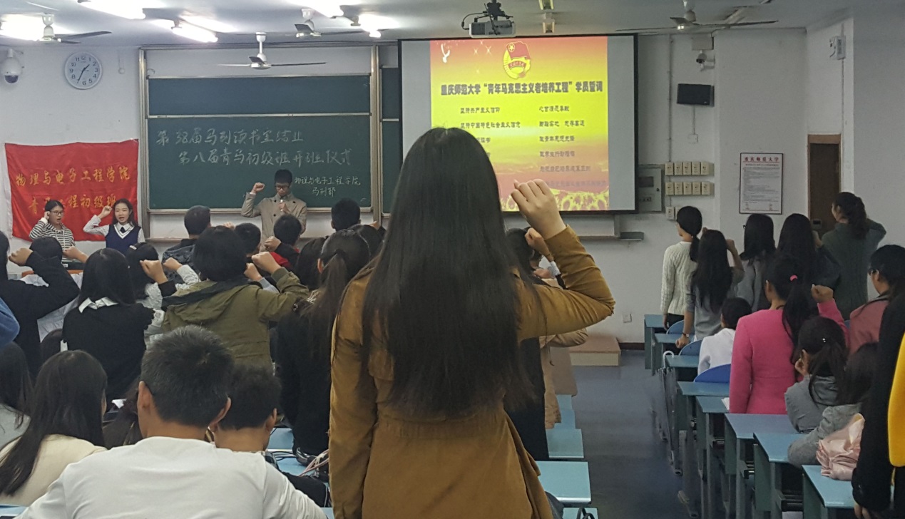 李青松老师在开幕辞中谈到了“青马工程”的性质,并在鼓励大家初级班结束之后继续参加中级班和高级班的学习时说,“习近平总书记当年来重庆视察,在我校的图书馆楼下照相,当时围绕在他身边的就是‘青马工程’的同学。”李老师还告诫大家,在学习生活中,不管是讨论还是参加活动,都应该恪守一条底线——做一名有道德有修养,然后才是有知识有文化的优秀当代大学生。随后,由余海蔚老师宣读第三十八届马列读书室优秀成员名单,漆佳老师宣读第八届青马初级班成员名单。