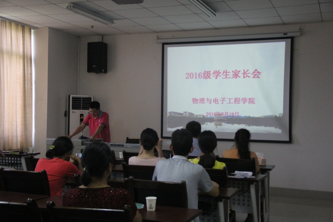 会议开始时,学院团总支书记李青松老师简短的自我介绍正式拉开了家长会的帷幕。紧接着,唐敏老师用铿锵有力的声音为在座的每一个人介绍了重庆师范大学和物电学院的发展历史、校园环境等。“没有功底丰厚的老师,就很难有出色的学生。”唐敏老师坚定地说道。接着,唐敏老师为新生和家长隆重介绍了物电学院优秀的师资队伍,同时也为大家展示了物电学院先进的实验设备。当看到如此优秀的物电学院时,新生和家长表现出了对学院无比的信任。在一系列的介绍之后,冉久飞老师站上讲台,与家长们谈论了“教子之法”。冉久飞老师说:“孩子们到大学最主要的目的就是学会独立,学会为人处世之道。”这个观点得到了在座家长的认同。“孩子和家长应该多沟通,并互相尊重。”老师为家长和新生分享道。