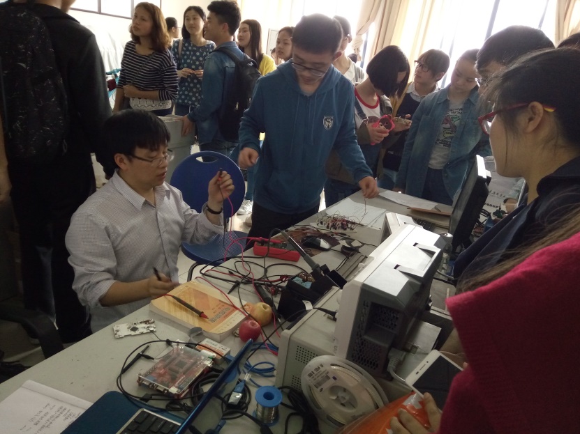 秉承物电学院的科技精神,本次大赛既延续了赛事的举办,又达到了内容的创新。比赛内容包括了开关电源、抢答器、音频功率放大器、毫姆表以及光控实验室人数计数器的设计及成品展示。罗海军老师对参加制作音频功率放大器的小组作品进行了成品检验与评分,电压的调试,电路连接,功率测定,音效试听,每一项都作了仔细的评定,针对同学们的不足之处都给出了专业性指导,并对同学们的辛勤成果予以肯定。一个名为“新新之火”的作品因其性质优良而无出其右。在实验室的另一角,何传红老师则对光控方面的作品进行评分,对于光控感应器的计数器是否准确报数,何老师与选手沟通交流了其中的经验,并给出了相应的改进意见。而温开旭学长就对其他几项的参赛作品做出评判,反复的检验,细致的观察,最终给出评论。