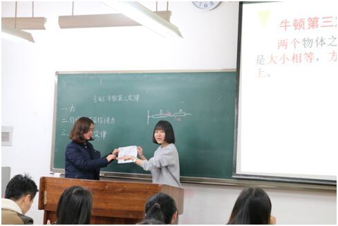 在主持人的热情开场后,大赛按时拉开了序幕。比赛分为两个部分,第一部分为即兴演讲,选手们赛前随机抽取即兴演讲的题目,并在演讲之前结合题目进行为期3分钟的演讲。在即兴演讲中,选手们针对自己抽到的题目各自抒发了自己对物理教学、课堂把握以及教书育人的深刻见解,言语之中透露出他们对物理教育事业的自信以及对自身的严格要求,这是一名标准的物理教师所应具备的素质。而第二部分是10分钟的课堂模拟教学,这是本次比赛的重头戏,也是考验同学们的个人能力的时刻。枯燥抽象的物理现象及其原理通常情况下是难以理解的,选手们中不乏有人将物理实验搬到了课堂上,邀请在场同学进行小试验等相关互动,风趣形象地带动了听者对于课题的理解,在寓教于乐中营造了良好的课堂氛围。