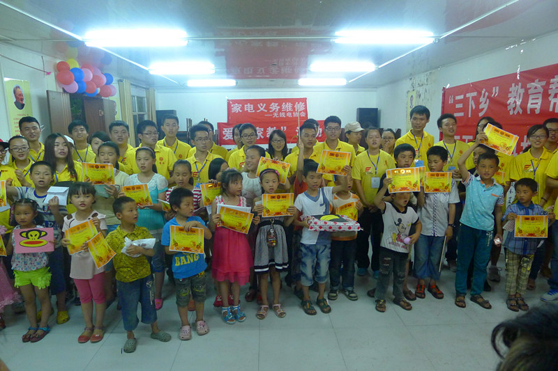 以活动为契机,重师大物电学院的学子紧跟全国青年学生开展“三下乡”社会实践活动的热潮,在社会服务中充分发挥师范专业优势。七月流火,志愿者们将平时书本上的理论知识应用到第二课堂平台中,用爱画圈,用心聚力,为北门村的小朋友们编织了一个彩色的夏之梦。亲手搭建的上课教室,临时打造的“坝坝世界杯”,都是对志愿者们创造力和组织力的考验。从简单的舞蹈动作到奇妙的科学知识,从梦想绘画到翰墨书法,从寓言故事到趣味英语,最后汇聚成成果展上的一幅幅作品秀,家长对自己孩子这几天的优秀表现给予赞许,也对志愿者们辛勤的付出表示最真诚的感谢。