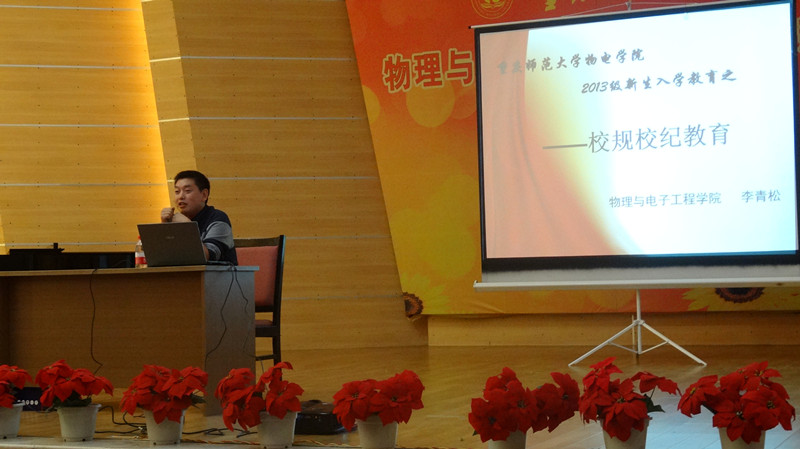 首先,李老师对13级全体新生的到来表示热烈的欢迎。然后,李老师对校规校纪进行了全面的解读,并要求全体同学牢守各条规则。小到日常行为习惯,大到集体责任意识,每一个同学都应该从基本做起,遵守条例,提高自己的自省、自律能力。接着,李老师简单介绍了学校和学院的一些常规管理工作,更是耐心的为同学们解读了学生学籍管理和学生学分制度。最后,李老师从思想教育的观点出发,开导大家在新的环境中要做好心理上的调节,尽量尽快地脱离自己的迷茫,树立积极向上的生活态度,完成自己经历过灰色高考后的美好大学梦想。