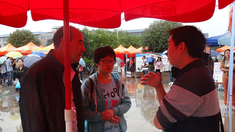 天公不作美,一大早就下起了雨,但同学们依旧坚守在自己的岗位上,收取录取通知书、派发体检表、绿色通道、缴费二次签到……每一个流程都开展的井然有序。在迎新现场,志愿者们为新生解答各种问题,将他们的物资、行李安排妥当;冉久飞、李青松二位老师耐心地与新生家长交流,让他们更深入地了解学院。
