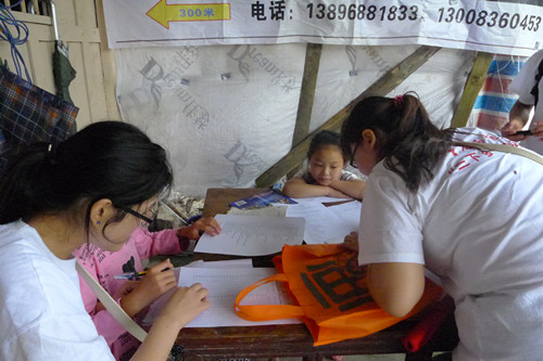 伴着欢声笑语,志愿者们相互合作帮忙将桌椅就位,小朋友们纷纷拿出了自己的暑假作业,认真地做了起来,那一张张纯真的面庞在朝阳的映衬下是那么动人…陆续地,可爱的小朋友们开始积极的举手向志愿者们寻求问题的答案,有问英语的,有问数学的,志愿者们耐心、仔细地讲解,小朋友们带着敬佩的眼光频频点头,志愿者们开心的微笑着,画面永远定格在那美好的瞬间。带队李青松老师也加入了志愿者的行列中,还手把手的教小朋友们在田字格写下“我的中国梦”这五个字,详细地为小朋友指出作业中的错误,小朋友们都亲切地称他为“老大”。