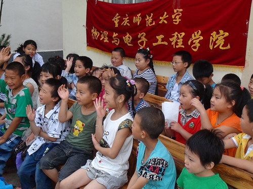 太阳在不知不觉中慢慢的显露了它的威力,但是火热的太阳不及志愿者火一样的热情,更不能把小朋友们对知识的渴求减弱,在温馨快乐的氛围里,大木乡的风吹拂着我们火红的旗帜,飘扬的不仅是志愿者对小朋友的引导、鼓励和爱,更是对青春和梦想最好的诠释!热气渐渐逼近,小朋友们仍然依依不舍,从他们坚韧的眼神中我们看到了他们对知识的渴望,更仿佛看到了他们心中那一份份梦想。在把小朋友送回去的路上他们还在不停的询问“老师,我们明天可不可以再来。”志愿者们带来的不仅有知识,更有他们的爱心,他们对这个社会拥有的责任感。