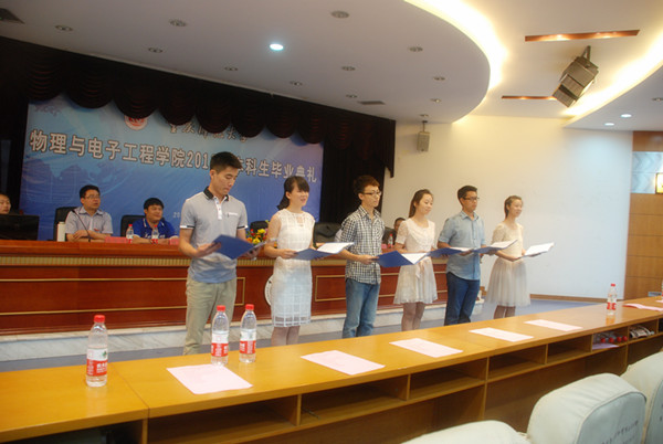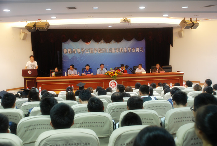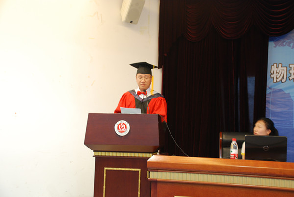 典礼开始,在冉书记激情洋溢的开场白之后,众人一起观看了2009级毕业生毕业纪念视频,一起回忆,懵懵懂懂的大一,轻舞飞扬的大二,壮志凌云的大三,青春无悔的大四,那点点滴滴都是是数不完的欢乐,道不尽的成长。然后,唐敏书记就大家四年内的优异表现进行总结,肯定了09级同学们在学习上的努力与付出,并宣布优秀(良)毕业生和考取研究生名单。接着,学院学术委员会主席崔玉亭教授宣布授位决定,依次为同学们进行了神圣的授位仪式。在大家的一阵阵欢呼声中,教师代表苑进社教授走上台发言。苑教授回顾过去四年里与同学们在一起的学习生活,对大家积极向上、求实进取的学习态度进行褒奖。并用这么一段话,鼓励毕业的同学们——“过去的四年里,在老师和同学们的积极配合下,很多同学的物理思维能力更加敏捷。在未来,还有广阔的科研环境等着大家的加入,大家应该更加努力朝着梦想的方向前进。”紧接着,毕业生代表汪洋饱含对学校、学院的感谢之情和同窗四年各奔天涯的不舍之情的发言,讲出了毕业生们的心声。在重师,他们学习到了“学高为师、身正为范”的精髓所在;在物电学院,他们学到了“志存高远、脚踏实地”的成功秘诀。