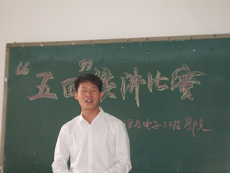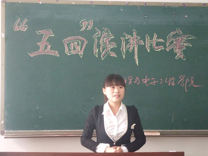 2013年4月25日,在同学们的殷殷期盼中,五四演讲比赛决赛在弘德楼13402如期举行。出席本次比赛的嘉宾与评委有2012级辅导员张坡老师、物电学院团总支·学生会学生书记匡珏环、文艺部部长袁晓晨以及特别来宾—校广播站的苟珊笛同学。
