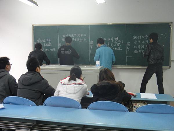 本次书法大赛首先由各个班级的学习委员来统计参赛的人数,宣传部设计海报,协会准备好要用的物质,另外每项比赛设计了六个奖项,优胜奖不等。比赛时每个人临场进行钢笔粉笔和毛笔字书写并有相关的负责人拍照。粉笔现场更有评委进行现场评分,比赛过程中,同学们的积极性较高,都倾尽自己所有来展示自己,很多人写完字后会心一笑,大家开心的面容让评委们也忍不住觉得开心,现场气氛活跃温馨。