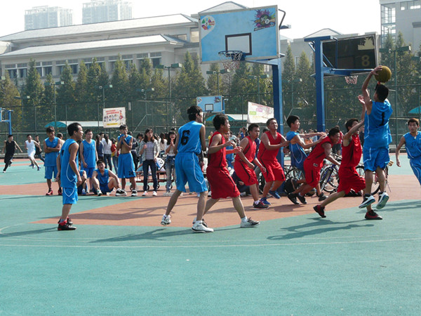 随着哨声落地,啦啦队也应声高呼,比赛开始,12级新生活力奔放,首战告捷,12级新生以14:8的成绩领先几分,2010级的篮球成员们以稳重求进的风格、默契的配合,使得场外的掌声此起彼伏。中场休息,王崇明老师为同学们总结上半场的不足,指出应对方针并鼓励大家不要气馁,争取反败为胜。下半场,果然12级新生用活力·激情和不断成长的经历证明了这股新生力量的不甘落后,不到10分钟就打出震撼全场的佳绩25:25,这让比赛进入了白热化状态,大家都提高警惕,精神高度集中,10级学长们依旧从容镇定,12级学弟们也是死控对方不让进球,就在时间仅剩下2分4秒的时刻10级学长投中一个2 分球,将比分再超,全场惊呼声再起,最终双方在最后时刻都没能有机会再进球。