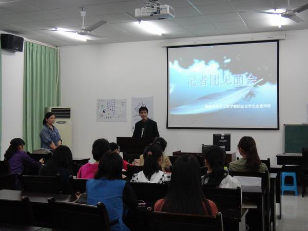 首先,黄部长向大家简单介绍了通讯部记者团的整体策划及未来的发展;然后院学生会主席张磊发表个人对记者团的希望,接着,通讯部干事代表发言,表达自己进入通讯部的工作规划,最后,黄部长进行了一个特色的自我介绍仪式,让同学们消除上台讲话的恐惧,并宣布了记者团及干事培训班的开班。