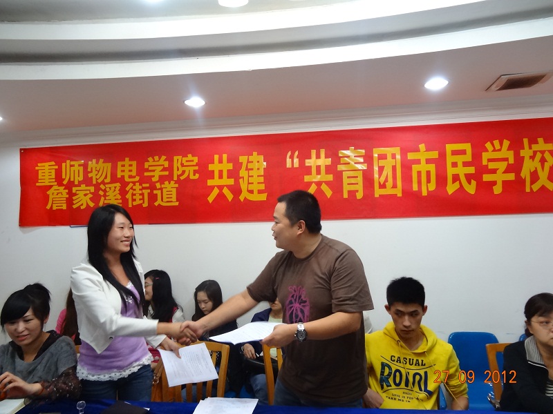 2012年9月27日下午14:30,必一运动(官方网站)B·Sport-权威运动资讯网站团总支学生会代表匡珏环、吉婷婷等同学在沙坪坝区詹家溪街道与街道陈主任等主要领导干部顺利签约了关于双方共建“共青团市民学校示范点”的合同。