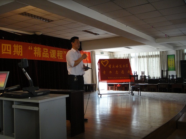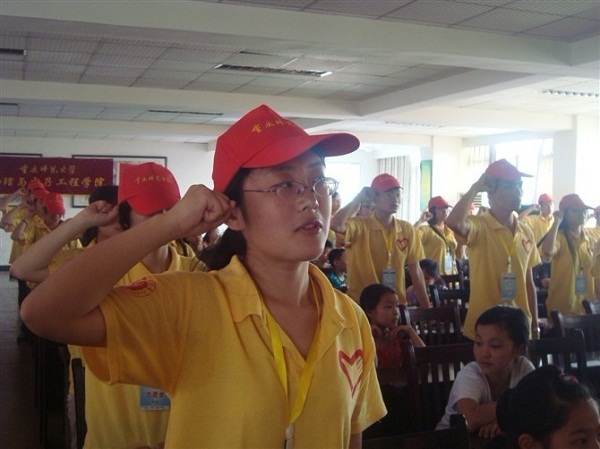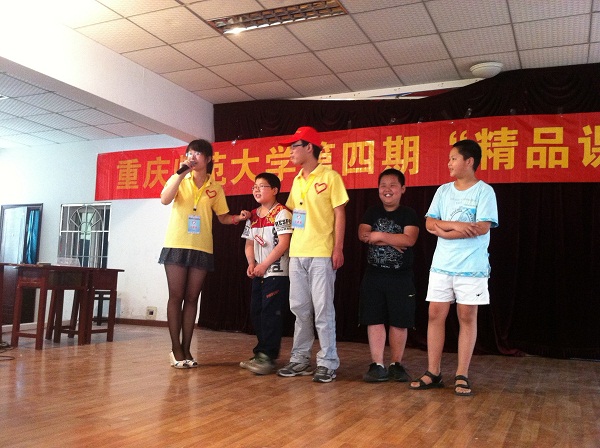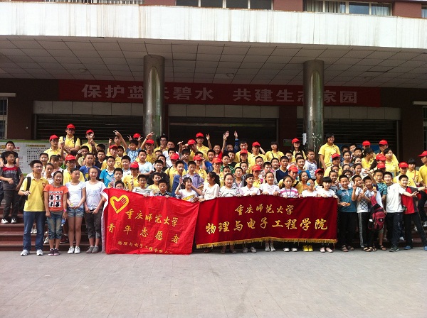 顶着炎炎的烈日,重庆师范大学的50名志愿者及相关负责人来到了重庆市璧山县金剑小学开展第四期“精品课程”的启动仪式。仪式在主持人激情高昂的声音中展开。首先,金剑小学校长吴英语致辞,表达了他对本次“精品课程”活动的支持以及对志愿者的由衷感谢。紧接着,青年志愿者带队老师余海蔚发表讲话,由衷地感谢金剑小学为志愿者提供锻炼机会,同时也对志愿者后期服务提出了期盼和要求。接下来,志愿者代表发言,并带领全体志愿者宣誓,展现他们对志愿服务的忠诚和热情。最后,别出心裁的互动环节带动了全场的气氛,促进了志愿者与学生的交流,也将此次活动拉近了尾声。