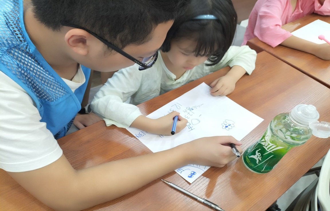 图为志愿者正在教小朋友画画。 邓文孟 摄