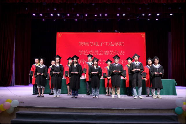 毕业典礼以一部毕业生纪念视频温馨开场,低年级学生精心准备的节目为学长学姐送上真挚的祝福。杨云书记宣读优秀毕业生名单,张丁可副院长宣读授位决定,授予杨晨等36名2023届研究生硕士学位、授予吴继林等337名2023届本科毕业生学士学位。学位委员会委员代表为毕业生授位,拨穗正冠,昔日青涩少年已学有所成,可以展翅高飞了。物理学师范专业本科毕业生罗昳同学、凝聚态物理专业硕士毕业生彭佳欣同学依次代表毕业生发言,分享成长感受,感谢学院的教育和培养,并祝愿学院发展更上一层楼。