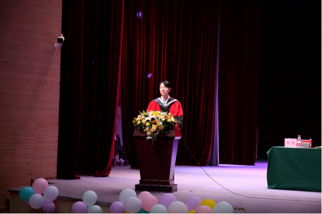杨晓红教授代表教师发言。她饱含温情,悉数回忆2023届学生成长的点点滴滴,肯定了孩子们大学期间竭尽全力战胜各种困难去追寻梦想。毕业之际,她提出三点希望:一是要以乐观心态面对生活;二是要始终保持善良和宽容;三是对待工作要抱有纯真的理想和不变的热情。最后,她祝愿全体毕业生展翅高飞,开拓更为广阔的天地!