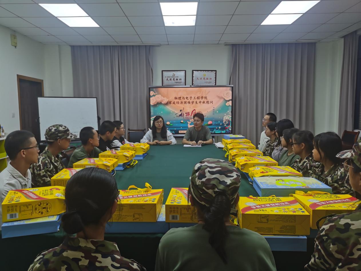 悠悠秋风起,又见中秋到。为传递节日的温暖与祝福,让新生中家庭经济困难学生在佳节中感受到学校和学院的关心,2023年9月26日,物理与电子工程学院在集贤楼518举办了新生家庭经济困难学生中秋慰问活动。学院分团委书记余海蔚、辅导员马梓茂及2023级困难学生参加了此次活动。