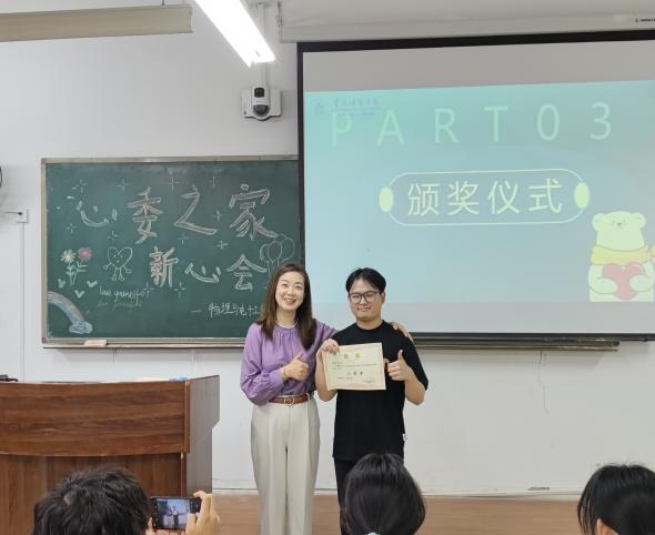 成立大会邀请赵和平老师为参加首次心理委员技能大赛的同学颁奖,肯定和鼓励心理委员积极参加各级各类比赛和活动,提升自身综合素质。最后,通过击鼓传花游戏做自我介绍和工作分享交流,心理委员们在欢快的氛围中相互赋能。