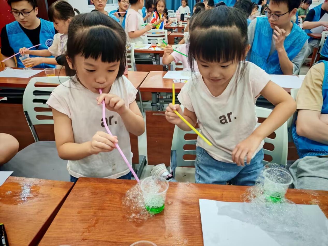 孩子们手持吸管,蘸取特制的彩色泡泡水,轻轻吹气后在画纸上留下绚丽的泡泡印记。泡泡破裂后留下的色彩印记,被共同拼成小花朵、小太阳等可爱图案,在孩子们的创意构思下,一幅幅充满想象力的泡泡画逐渐呈现。志愿者解释道:"泡泡之所以有颜色,是因为光在泡泡膜上下表面反射产生的干涉现象。"