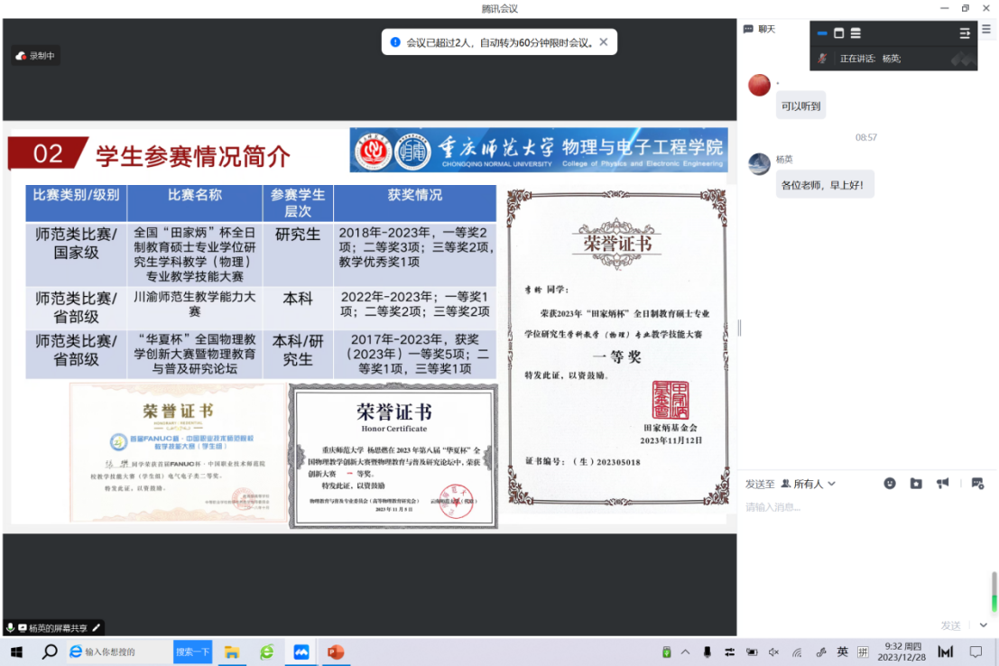 本次活动围绕两个主题:第一,如何上好《物理学科教学论》课程?第二,重庆师范大学物理教育虚拟教研室介绍带学生比赛的相关工作。
