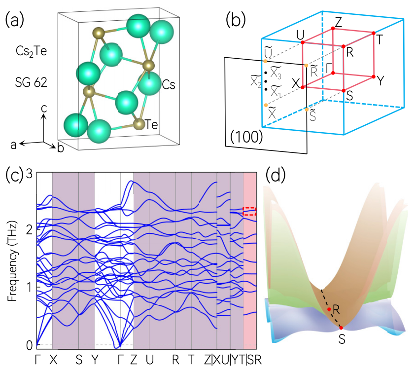 因为在三维固体材料中的拓扑声子态往往是对称性驱使的,因此通过空间群来讨论某一类同素异性体材料的拓扑声子态及其潜在的应用变得十分有意义。杨英老师所在团队将目标汇聚到二元Cs-Te系列材料,并根据相图来确定其同素异形体的种类,继而研究拓扑物理性能及其潜在应用。通过计算和对称性分析,发现Cs-Te系列材料中存在丰富的拓扑声子态包括手性为2的Dirac点声子、手性为1的Weyl点声子、二次接触三重点声子、三重简并声子,蝴蝶状Weyl节线声子,Dirac节线声子、Weyl结环声子、多个直Weyl节点线声子、节笼声子、一个节表面声子、两个节面声子和三个节面声子等。具体内容见:“Topological phonons in Cs-Te binary systems”PRB107, 054310 (2023)