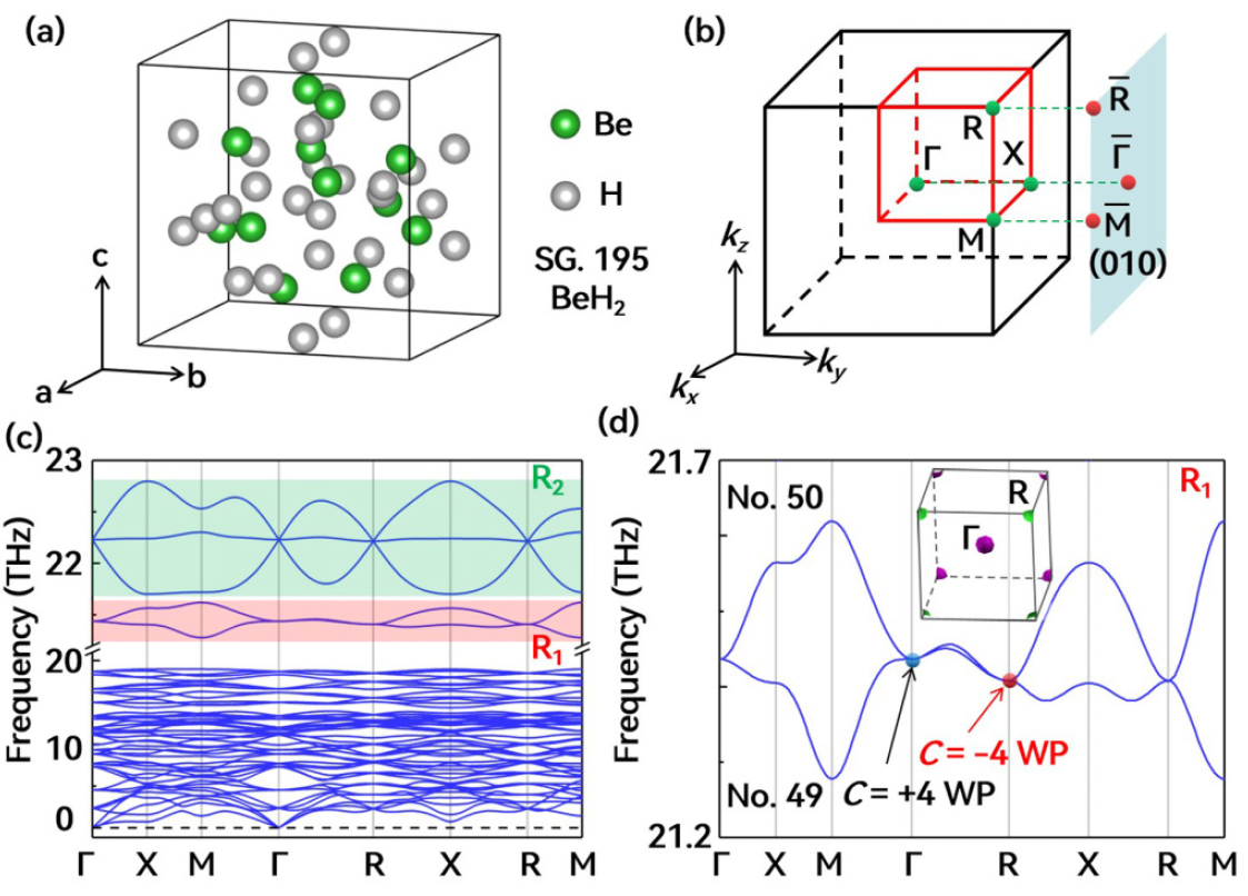 在众多拓扑半金属中,Weyl半金属是非常重要的一类。自2011年Weyl半金属概念被首次提出以来,研究人员一直在努力寻找Weyl半金属材料。在材料实现方面,一个关键条件是低能带结构应尽可能简单,最好的情况是只有单对(即两个)Weyl点。到底单对Weyl点能不能在非磁系统中出现呢?在这个疑问的驱动下,杨英老师所在团队通过第一性计算原理和对称性分析首次证明在P23型BeH2中出现最大电荷数(手性为±4)的单对Weyl点声子。此外,通过分别沿[100]和[111]方向施加1%和2%的单轴应变,发现可以调整BeH2材料中的Weyl点的数量,Weyl点的电荷数,和声子表面模式类型。另外,文章还首次报告了P23型BeH2中出现了两个单对三点声子,并研究了单轴应变下相关的手性声子转变。具体内容见:“Maximally charged single-pair multi-Weyl point phonons in P23-type BeH2”PRB107, 024304 (2023)