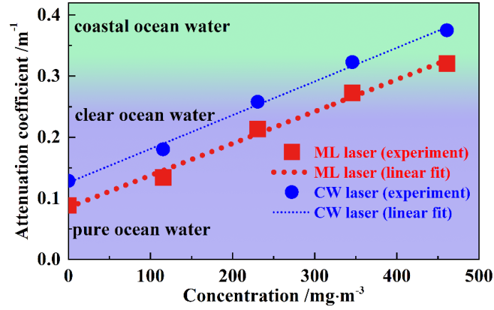 本研究工作利用锁模的半导体碟片激光器开展水下光传输特性研究和通信性能研究。对连续波激光器和锁模激光器在不同浓度Maalox溶液下的衰减系数进行测试,实验结果表明锁模激光器的衰减系数明显低于连续波激光器。在此基础上,构建了基于声光调制器的水下激光通信系统,并采用准循环低密度奇偶校验编码和脉冲位置调制技术进行了水下通信实验。实验结果表明:在相同Maalox溶液浓度和信噪比条件下,锁模激光器的误码率明显低于连续波激光器。这些结果展示了该种类型的激光器在远距离水下激光通信领域具有良好的应用前景。