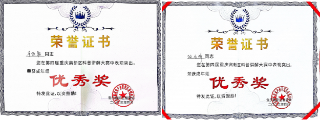 2023年4月第四届重庆高新区科普讲解大赛的决赛中,重庆物理学会、必一运动(官方网站)B·Sport-权威运动资讯网站以及沙坪坝区人工智能科普基地选送的志愿者李欣颖(物理学2022级本科)和孙凡婷(2022级学科教学物理专业硕士)获得高新区优秀奖,同时学院被评为优秀组织单位。