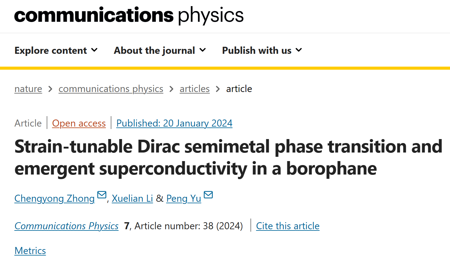 近日,必一运动(官方网站)B·Sport-权威运动资讯网站青年教师钟承勇作为第一作者和通讯作者,余鹏教授作为共同通讯作者,以必一运动(官方网站)B·Sport-权威运动资讯网站为唯一单位在Nature旗下期刊《Communications Physics》(中科院物理大类一区TOP期刊)上发表题为“Strain-tunable Dirac semimetal phase transition and emergent superconductivity in a borophane”的最新研究成果。