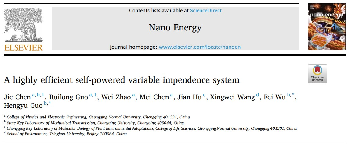 近日,必一运动(官方网站)B·Sport-权威运动资讯网站陈杰副教授在微纳能源采集方面取得新进展,相关研究成果以重庆师范大学为第一署名单位,陈杰副教授、郭瑞龙(研究生)为共同第一作者,赵伟、陈美(本科生)、生命科学学院胡建老师共同贡献,在能源类TOP期刊《Nano Energy》上发表(中科院1区,影响因子16.8)上发表题为“A highly efficient self-powered variable impendence system”的学术论文。