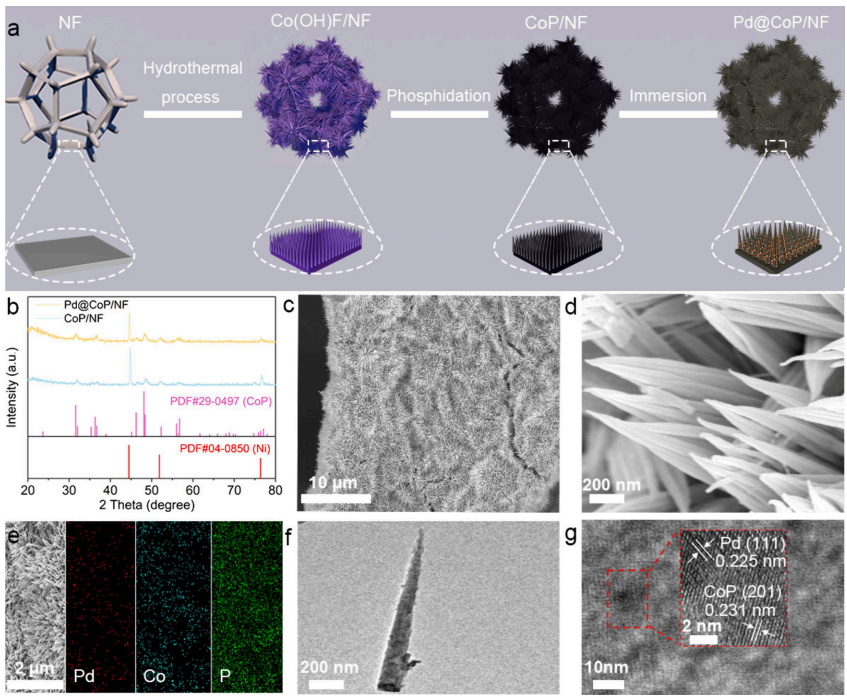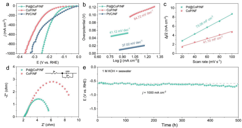 海水电解制氢是通过电解海水产生氢气的一种清洁能源技术,具有广阔的应用前景。然而,由于海水成分复杂,开发高效且稳定的电催化剂对于实现这一目标至关重要。氢溢出现象是指在固体催化剂表面,氢原子从一个活性位点迁移到另一个活性位点的现象。基于此,光学检测与成像系统课题组通过水热-磷化-浸渍法成功开发了一种高效稳定的电催化剂Pd@CoP/NF,用于碱性海水中的氢气演化反应(HER)。这种催化剂在1000 mA/cm⟡的电流密度下,仅需249 mV的过电位,并且在500小时的长时间运行中表现出色。表面的Pd纳米颗粒和CoP纳米针之间的氢溢出现象,提高了HER的反应效率和动力学。