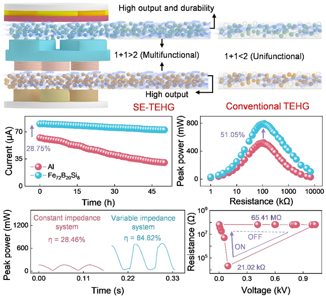 实验结果表明,与常用的铝材料相比,Fe72Si8B20不仅使TENG的输出电流和电流保持率分别提高了28.75%和85.24%,而且使EMG的输出功率提高了51.05%。这一成果为TEHG的性能提升提供了新的思路和方法。此外,在使用TEHG构建自供电系统时,课题组还发现了能量采集器与应用端之间存在显著的阻抗差异。为了解决这一问题,课题组在没有电源管理电路的情况下,展示了一种自供电可变阻抗系统,该系统实现了比传统恒定阻抗系统高2.98倍的能源利用效率。