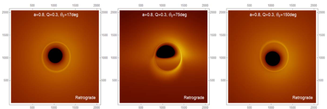图2:顺行和逆行吸积盘下Kerr-Newman黑洞的图像。
