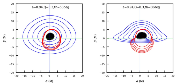 图1:不同黑洞参数和观测角度下的粒子轨道图。