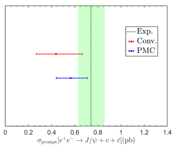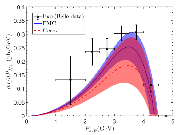 粲夸克偶素物理一直是检验非相对论量子色动力学(NRQCD)有效理论的前沿课题。例如,J/ψB工厂中通过正负电子湮灭到双粲的产生,既为人们研究重夸克偶素产生机制提供了机遇,也对NRQCD理论的有效性提出了巨大的挑战。对于单举过程,e+ + e- J/ψ + c + cbar过程的实验测量结果为0.74pb,比包括了NRQCD领头阶的色单态和色八重态的理论预言(0.1~0.2pb)大了约5倍。当计算了e+ + e- J/ψ + c + cbar的次领头阶QCD辐射修正后,缩小了理论预言和实验结果之间的差距,验证了理论结果的正确性。但是,由于粲物理能区较为靠近非微扰区域,其微扰展开收敛性不是特别的好,次领头阶截面是领头阶截面的1.8倍左右,并且其次领头阶截面仍然存在较大的重整化能标依赖,e+ + e- J/ψ + c + cbar的次领头阶预言存在43%-132%的误差范围。本研究基于最大共形原理(PMC)在次领头阶精度下成功消除了此过程的重整化能标不确定性。这一改进使得其总截面的理论预言与Belle实验组的测量结果之间的差距进一步缩小约17%,并且能成功解释动量分布微分截面的实验测量结果。