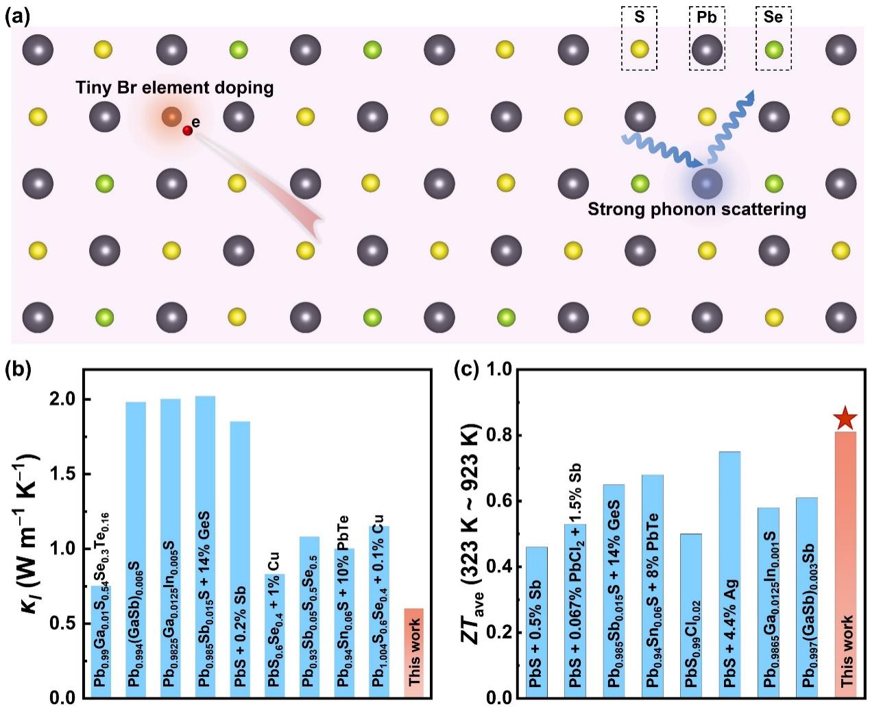 该研究选取地球上储量丰富且成本低廉的PbS作为研究对象,创新性地采用精细掺杂策略,并巧妙结合声子非谐性工程,成功实现了对热电性能在整个温度范围内的全面优化。通过引入微量Br作为掺杂剂,实现了近乎100%的超高掺杂效率。这一突破极大地减少了外源载流子散射现象,为载流子提供了更为顺畅的传输通道,从而确保了高载流子迁移率。此外,进一步的Se固溶有效增强了Pb原子的局部振动,进而强化了非谐声子散射效应,使得晶格热导率大幅降低。最终,在PbS₀.₆₉₆Se₀.₃Br₀.₀₀₄样品中,该工作成功实现了高达0.81的ZTave值(323−923 K),这一性能指标明显优于其他n型PbS基热电材料。