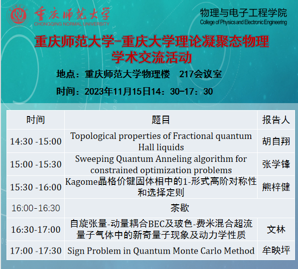 此次学术交流活动报告有高度、有深度、有广度,为参会师生呈现了一场学术盛宴,与会师生纷纷表示,收获颇丰。本次学术交流拓宽了参会学生的学术视野,营造了浓厚的学术氛围,对学院理论物理学科建设、人才培养和交叉学科研究具有积极的作用,同时也加强了重庆师范大学理论物理团队与重庆大学强关联物理团队的交流与联系。