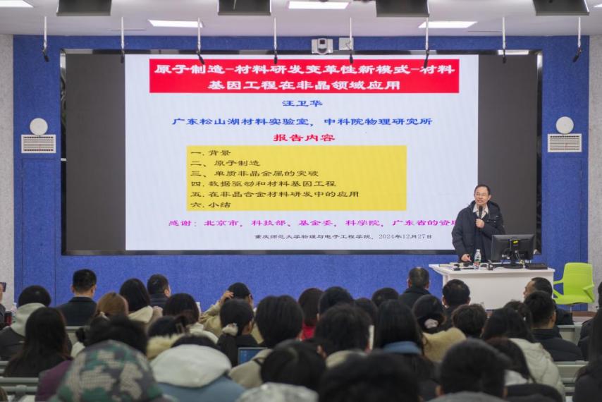 12月27日下午,中国科学院院士、松山湖材料实验室主任、中国科学院物理研究所汪卫华研究员应必一运动(官方网站)B·Sport-权威运动资讯网站邀请到我校作题为“原子制造-材料研发变革性新模式-材料基因工程在非晶领域应用”的学术报告。必一运动(官方网站)B·Sport-权威运动资讯网站及相关专业师生参加了讲座报告由必一运动(官方网站)B·Sport-权威运动资讯网站院长余鹏教授主持